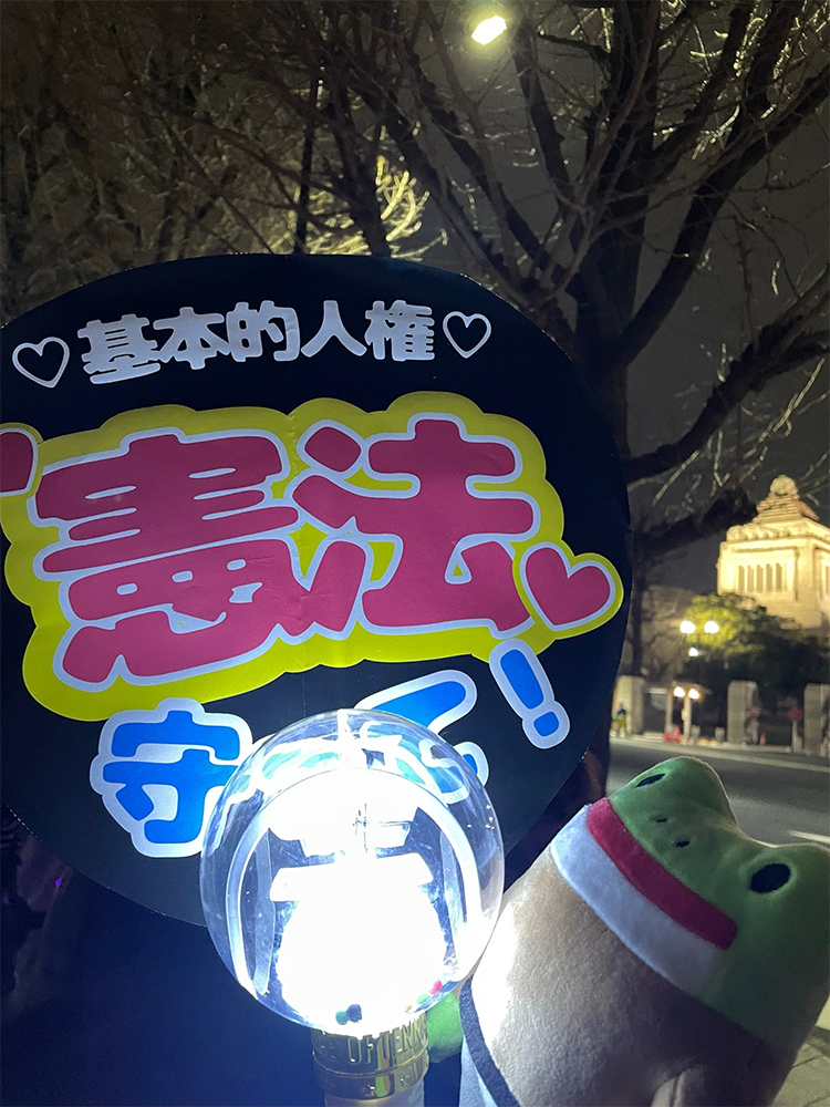 首相官邸前で行われた『平和憲法を守るための緊急アクション』に参加しておりました すごいいっぱい人がいたしペンライトの光でキラキラで元気出た!!! 推しジャンルのペンライト持ってるオタクがいっぱいいて、良かったな……(わたしもテニミュのペンラを持っていきました) (ドリライ2020のやつ……)
